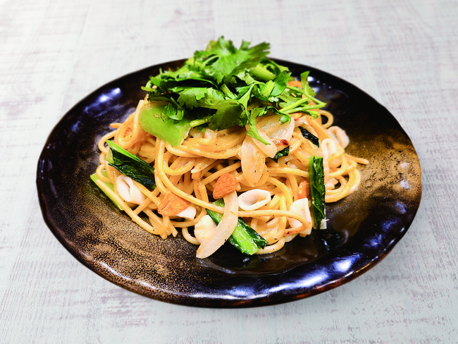 そのロメスパバルボアから、このたび期間限定で登場するスペシャルメニューが「グリーンカレー」。もちもち食感の極太スパゲティに小ヤリイカを合わせ、小松菜、玉ねぎと共にコク旨のグリーンカレーソースで香ばしく炒めあげた創作スパゲティです。エスニック感がさらにアップするパクチーと、香りはもちろんのこと、食感のアクセントがたまらないアーモンドを仕上げにトッピングしています。さらに、パクチー好きな“パクチニスト”の方のために、追いパクチー(+150円)もご用意しました。