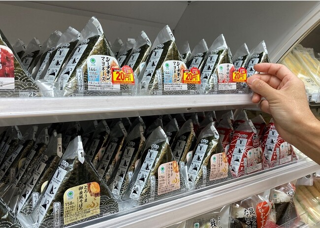 2021年7月から、消費期限の迫ったおむすびや弁当などの中食商品に、バーコード付きの値下げシールを貼って値下げ販売する取り組みを実施しています。レジでバーコードを読み込むと自動的に値下げされます。値下げのタイミングや価格は、各店舗の判断で実施します。この取り組みによって、店舗での値下げの作業が簡素化されるとともに、食品ロスの削減に繋がります。現在、全国の9割以上の店舗で活用されています。