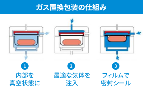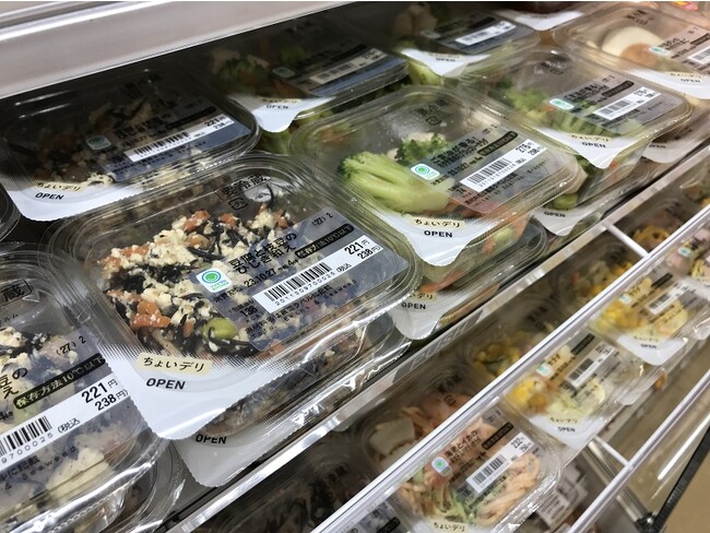 惣菜やサラダなどの一部商品に、特殊な包装技術であるガス置換方式を採用し、美味しさをそのままに消費期限を従来より1日~3日延ばす取り組みを行っています。ガス置換方式とは、容器内の空気を商品に適したガスに置き換える技術です。容器のふた部分をトップシール化することで、プラスチック使用量の削減も見込んでおります。