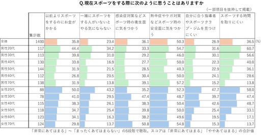 性年代別に見ると、「スポーツする時間を取りにくい」「以前よりスポーツをするのにお金がかかる」など複数の項目は男女それぞれで20代が最も高くなっており、スポーツをするのに悩みや問題点を感じることが多いようです。70代男女では、「熱中症やケガ対策などスポーツ時の安全面に気をつかう」「感染症対策などスポーツ時の衛生面に気をつかう」など実施環境を気にしている方が多いという結果になりました。「自分に合う指導者やスポーツクラブ・ジムを見つけにくい」は、全体では26.9%、男性は20~30代、女性は20~40代で3割以上の回答が見られました。