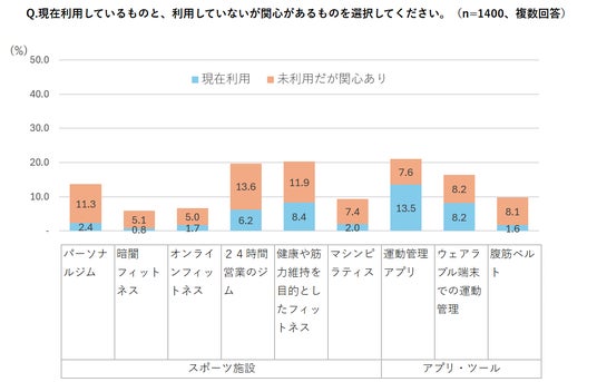 最近は施設や運動メニューなどに独自の特徴を持ったジムや目標達成をサポートしてくれるアプリなど、運動に関連する様々なサービスが出てきています。そこで、スポーツ施設やツールの利用状況と関心度について尋ねました。