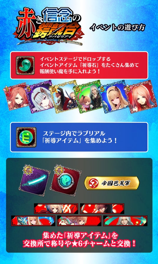 「祈導石」の獲得数に応じて『赤い刀 真』のコラボ使い魔「【十干】薺」や「【十干】ルベリス」が入手できます。また、イベント交換所では集めた「祈導石」を使用して原作イラストの使い魔と交換することができます。