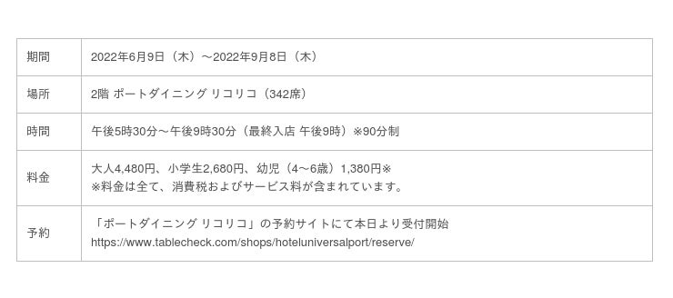 ユニバーサル・スタジオ・ジャパンのオフィシャルホテル「ホテル ユニバーサル ポート」(所在地:大阪市此花区、総支配人:金井 紀生)は、当館2階「ポートダイニング リコリコ」にて、2022年6月9日(木)~9月8日(木)の期間、夏のディナービュッフェ「大阪グルメフェア」を開催しますのでお知らせします。本日より予約受付を開始します。
