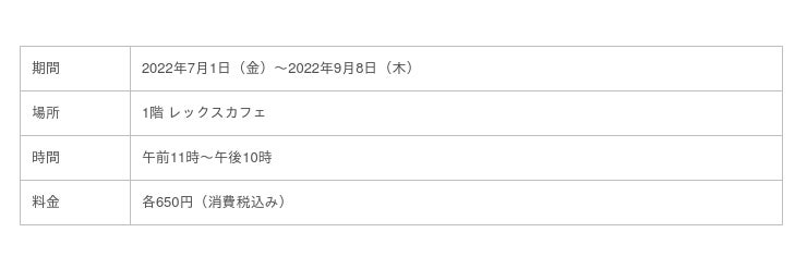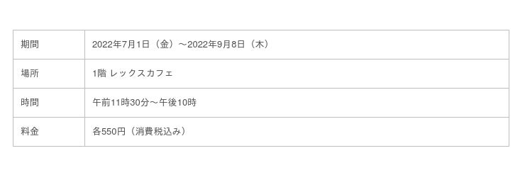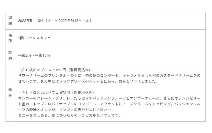 また、当館1階「レックスカフェ」では、夏季限定メニューとして、旬の桃やトロピカルフルーツなどのフルーツを使ったスイーツやフルーツソーダ、かき氷を販売します。あわせて、レックスカフェでご提供するかき氷が付いた期間限定の宿泊プランも登場します。