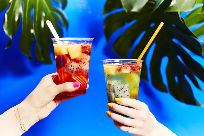 フレッシュな苺と凍らせたパイナップル、マンゴー、ドラゴンフルーツがゴロゴロ入った2種のフルーツソーダです。レッドはストロベリーとグアバ、グリーンはブルーキュラソーとパッションのシロップをブレンドし、爽やかな甘さに仕上げています。