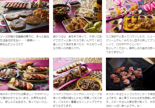 串かつ4種(牛、海老、うずら卵、エリンギ)、お好み焼き、たこ焼き、焼きそば、どて焼き、水なすと生ハム、キハダマグロのタタキ、ミックスジュースのババロア、パイナップル飴ヨーグルト、お好み焼き風ケーキ、串かつ風ガトーショコラ、みたらしプリン、冷やしあめタルト、など。
