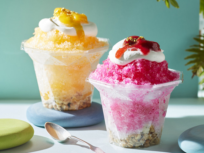 細かく削ったふわふわな氷に、それぞれ苺、マンゴーのシロップをかけ、なめらかな口当たりの生クリームをふんわりとのせました。底に敷いたグラノーラと混ぜ合わせると味と食感の変化を楽しめます。