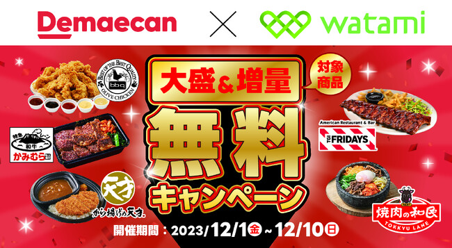ワタミ株式会社(本社:東京都大田区)が運営する「から揚げの天才」「bb.qオリーブチキンカフェ」「焼肉の和民」「かみむら牧場」「アメリカンレストラン&バー TGIフライデーズ」は、2023年12月1日(金)より、株式会社出前館(本社:東京都渋谷区)が運営する日本最大級のデリバリーサービス『出前館』にてグループ合同企画「大盛&増量キャンペーン」を開催いたします。