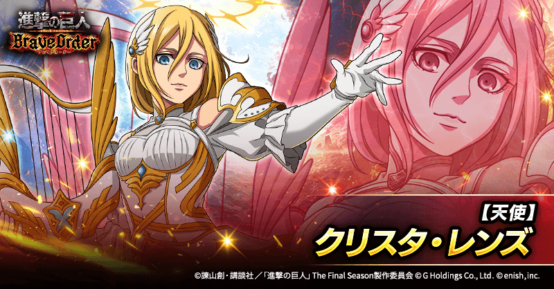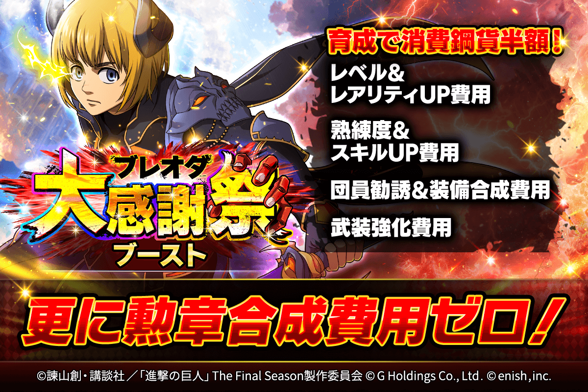 株式会社enish(本社:東京都港区、代表取締役社長:安徳 孝平、以下enish)は、アニメ『進撃の巨人』のスマートフォンゲーム最新作「進撃の巨人Brave Order」にて、2025年11月10日(月)より、ブレオダ大感謝祭を開催!今ならガチャなどに使用できる赤輝石が最大3,000個もらえちゃう!また大感謝祭前半ミッションではハンジの特別な衣装、白き翼と黒き魔影イベントでは育成素材の熟練技能書が最大300個がGET可能!その他、最新情報はゲーム公式サイト・ゲーム公式X(旧Twitter)アカウントにて随時公開して行きますので、ぜひご覧ください。