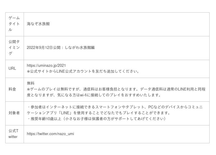 一般社団法人謎解きエデュテイメント協会は、LINE友だち登録者数5万人を突破した、海洋問題がテーマのオンライン謎解きゲーム「海なぞ水族館」の新規シナリオとして、2022年7月31日に「蒲郡市竹島水族館編」を公開。続いて同年9月12日(月)に「しながわ水族館」編を公開いたします。このイベントは、次世代へ海を引き継ぐために、海を介して人と人とがつながる“日本財団「海と日本プロジェクト」”の一環です。