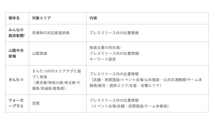 位置情報を元にしたプレスリリース掲載の取り組みを行うパートナーメディアと対象となるプレスリリース