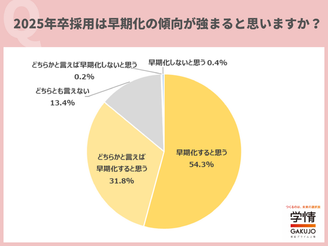2025年採用は、「早期化すると思う」と回答した企業が54.3%に上りました。「どちらかと言えば早期化すると思う」31.8%を合わせると、8割以上の企業が早期化すると考えてていることが分かります。「企業の採用ニーズが高まっている」「学生・企業ともに動き出しが早くなっている」「大手企業が早期からインターンシップやオープン・カンパニーの広報・採用活動を行う動きが、中堅企業やベンチャー企業にも波及している」などの声が寄せられています。