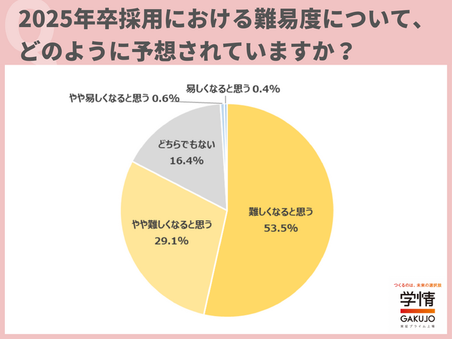 2025年卒採用について、「難しくなると思う」と回答した企業が53.5%に上りました。「やや難しくなると思う」29.1%を合わせると、8割以上の企業が「採用が難しくなる」としています。「年々早期化の傾向が強まっている」「若い世代の人口は減っていくので、新卒採用が今よりも簡単になることはないと思う」「早期化・長期化により、学生が動く時期が分散している。自社が採用したい学生がどの時期に動くかを見極める必要がある」「インターンシップに関するルール変更もあり、より多くの学生・企業が早くから動くと思う」などの声が上がりました。