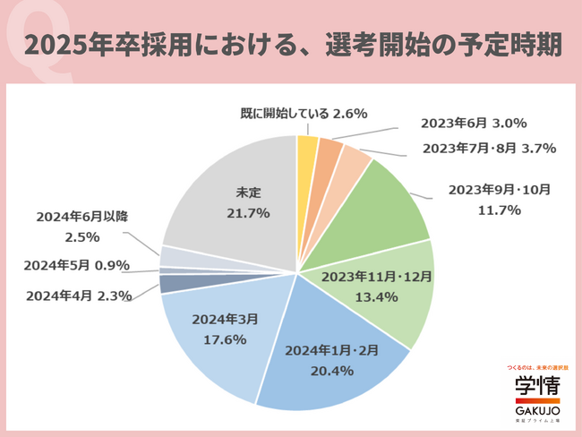 2025年卒採用の選考開始時期は、未定を除くと「2024年1月・2月」が20.4%で最多。次いで「2024年3月」17.6%が続きました。3年生のうちに選考を開始するとした企業が、約4分の3に上ります。