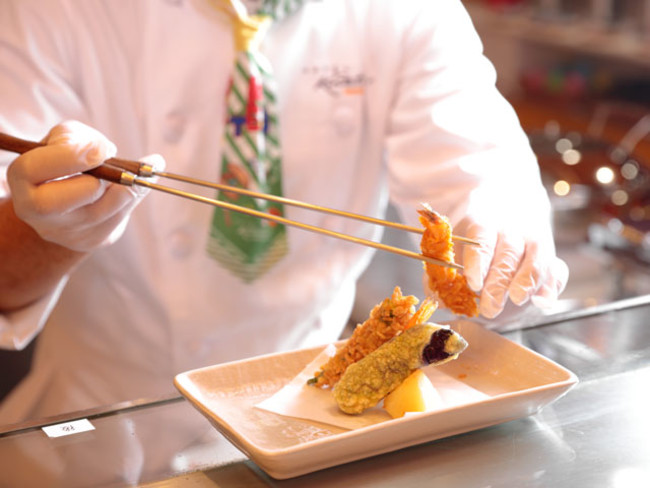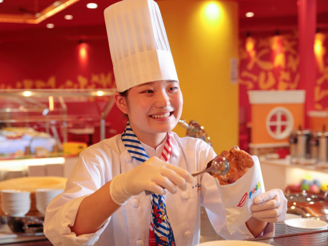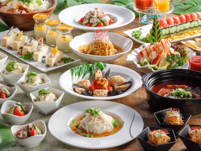 今回サマーフェアのテーマである「スタミナ & スパイシー」をもとに、平日ランチ限定で若手シェフが自ら考案した、食べると元気のでる幅広い世代に愛されるメニューを実演コーナーにてご用意します。衣にコーンフレークやあおさ等を使用し、さまざまな食感をお楽しみいただける「エビと野菜の変わり揚げ」や台湾で大人気のメニューをブッフェでも食べやすい大きさに工夫した「炸鶏排(ザージーパイ)」などを週替わりでお楽しみいただけます。