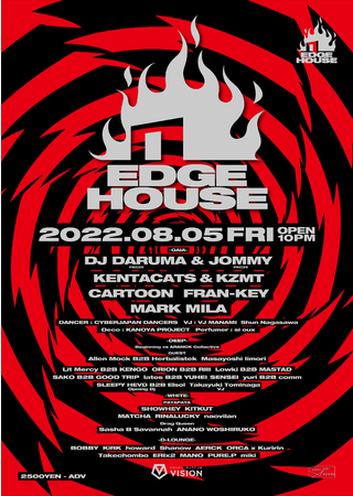 EDGE HOUSEは、2019年2月にローンチ、これまでの3年5ヶ月で63回開催、39組の海外アーティストを招聘してきました。現在進行形のHOUSE/TECH HOUSE/TECHNOを軸にした良質でエッジの効いたダンスミュージックで「グルーヴがあるフロア」を重視しています。また、ヴィジュアル・ライティング・デコレーション、さらに香りにもこだわるなど「五感を刺激するパーティ」を確立してきました。