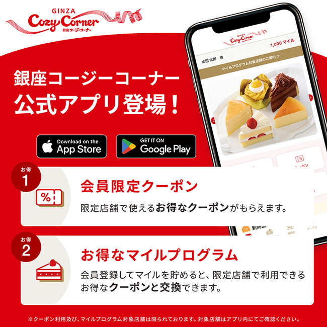 株式会社銀座コージーコーナー<代表取締役社長 船田知秀 東京都中央区>は、2023年7月25日(火)に銀座コージーコーナー公式アプリをリリースいたします。公式アプリでは新商品やキャンペーン情報等の配信に加え、当社初となるマイルプログラム(※関東を中心に約170店舗限定)をスタートします。