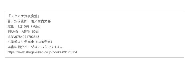小腹も心も満たしてくれる“めしや”が舞台の人気マンガ『深夜食堂』(https://www.shogakukan.co.jp/books/volume/19541)の著者・安倍夜郎と、絶品料理を紹介する『四万十食堂』『オアシス食堂』(安倍夜郎との共著)などの名店ガイドを発表してきた左古文男。滋味溢れる料理を追い求めてきたふたりが新たに手がけるのは、“食”で元気になれる本です。
