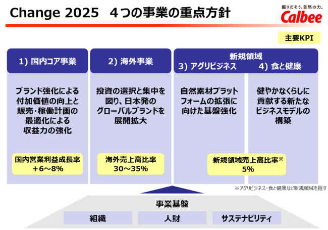 カルビー株式会社(本社:東京都千代田区、代表取締役社長兼CEO:伊藤 秀二)は、事業環境の変化を踏まえ、次なる成長に向けて踏み出すためには、企業の変革が重要であると認識し、改めて2030年に向けたカルビーグループ成長戦略と、2023~2025年度の変革プラン「Change 2025」を策定しました。