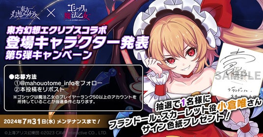 『東方幻想エクリプス』コラボイベント開催を記念して、博麗霊夢役「ファイルーズあい」さん、霧雨魔理沙役「伊瀬茉莉也」さん、十六夜咲夜役「加隈亜衣」さん、レミリア・スカーレット役「竹達彩奈」さん、フランドール・スカーレット役「小倉唯」さんのサイン色紙プレゼントキャンペーンを実施中です。