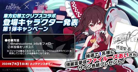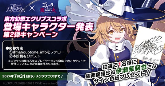オリジナル二次創作ストーリーをお楽しみいただけるコラボ記念イベントや、羽々斬先生の描き下ろしイラストを含むコラボ使い魔が獲得できるガチャの他、コラボ使い魔★5「霧雨魔理沙」がもらえるログインボーナスや出演声優のサイン色紙が当たるXキャンペーンなども実施中ですので、あわせてお知らせいたします。
