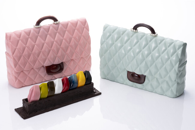 ファッショナブルなキルティングのモチーフが華やいだ印象を持つ、すべてチョコレートで創作されたハンドバッグ型の逸品。バッグの中には、唇の形にあしらったカラフルなボンボンショコラ「レーブル コロレ」8種を詰め合わせました。