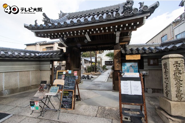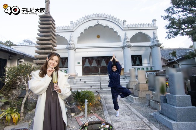 お寺にしては珍しい鉄筋コンクリート造りの本堂の前で松村が撮影した、こだわりの番組サムネイル用写真とは。