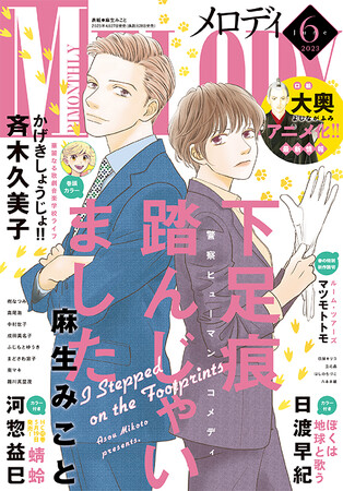 《株式会社白泉社》(本社:東京都千代田区、代表取締役社長:菅原弘文)は、『メロディ』2023年6月号を4月27日(木)に発売いたします。今号には、2023年夏独占配信予定のNetflixシリーズ「大奥」(原作:よしながふみ「大奥」)の情報を掲載。キャストの宮野真守さん、松井恵理子さん、梶裕貴さんからコメントもいただきました。表紙を飾るのは超人気・警察ヒューマンコメディ「下足痕踏んじゃいました」(麻生みこと)、巻頭カラーは「かげきしょうじょ!!」(斉木久美子)です。「ぼくは地球と歌う」(日渡早紀)、「蜻蛉」(河惣益巳)がカラーつきで登場です。マツモトトモの新作読切「ルーム・ツアーズ」もお楽しみに。