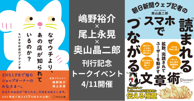 株式会社ディスカヴァー・トゥエンティワン(本社:東京都千代田区、取締役社長:谷口奈緒美)は2023年4月11日に、弊社刊行の『スマホで「読まれる」「つながる」文章術』著者・奥山晶二郎さんと、宣伝会議刊行の『なぜウチより、あの店が知られているのか?』著者・嶋野裕介さん、尾上永晃さんのトークイベントを、青山ブックセンター主宰にて開催します。
