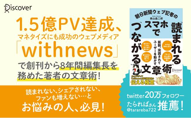 そして、2月に『朝日新聞ウェブ記者のスマホで「読まれる」「つながる」文章術』を刊行した奥山晶二郎さんは、「withnews」の創刊編集長として2014年に同メディアを立ち上げ、スタートから5年で月間1 億5千万PVを達成し、マネタイズも成功させました。本の中では“ウェブ記者”の経験の中で体得した、スマホで「読まれる」「つながる」文書の書き方を指南しています。