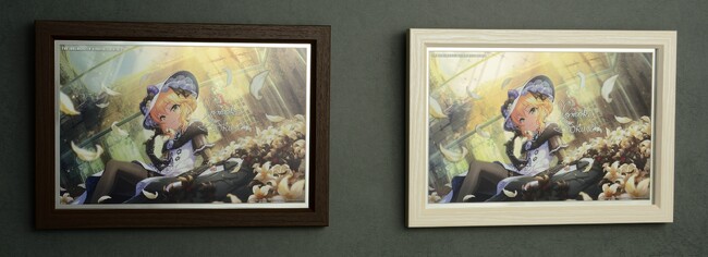 ずっしりとした木枠に収められた美しく輝くガラス製のミラー。ガラス製ミラーの特性に合わせた処理が可能にしたポートレート写真のような奥行きのある立体的な表現。白い花々を背景に、気品ただようモノトーンのドレスを身にまとい美しくほほ笑む彼女の魅力あふれる姿を写し取った一枚がここに完成しました。