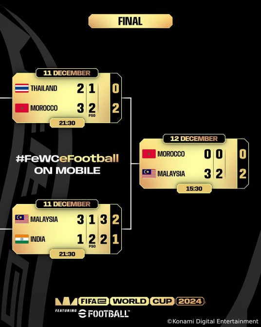 株式会社コナミデジタルエンタテインメント(以下、KONAMI)は、基本プレー無料の家庭用・PC・モバイルゲーム『eFootball(TM)』を競技タイトルとしたeスポーツ世界大会「FIFAe World Cup 2024(TM)」が12月9日から12月12日まで、サウジアラビアの首都リヤドで開催され、モバイル部門でマレーシア(MINBAPPE選手)が、家庭用ゲーム機部門でインドネシア(BINONGBOYS選手・SHNKS-ELGA選手・akbarpaudie選手)がそれぞれ初代チャンピオンになったことをお知らせします。