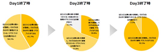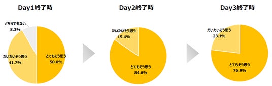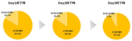 Day1終了時とDay3終了時とでは、「自分自身の「はたらく」や「しごと」を改めて考え直すことができたか。」という問いに対し、「とてもそう思う」と回答した人の割合が83.3%から92.3%に上昇するなど、全体的にポジティブな影響が見られました。