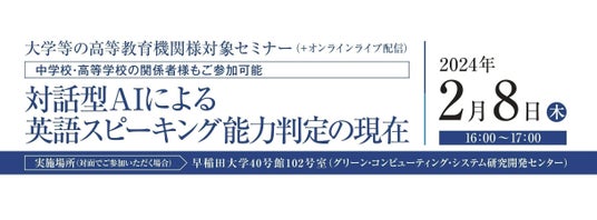 提供開始に合わせて、2024年2月8日(木)に早稲田大学で、学校関係者対象のセミナー「対話型AIによる英語スピーキング能力判定の現在」を開催します。セミナーでは、「LANGX Speaking」を開発した、株式会社エキュメノポリス代表取締役 松山洋一氏が登壇し、同サービスの特長、導入事例などを紹介します。