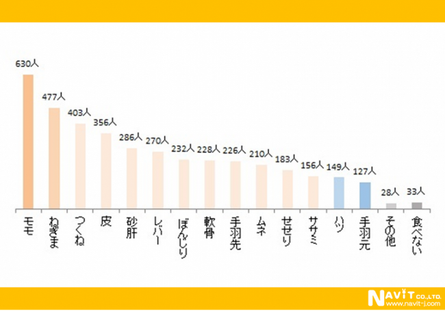 好きなネタを複数回答可で質問したところ、1人平均4つのネタを挙げています。「モモ」(630人)、「ねぎま」(477人)、「つくね」(403人)がトップスリーに座っていますが、14位の「手羽元」でも127人と回答者の12.7%を占めています。いろんなネタを楽しむ焼き鳥ファンの多いことがうかがえます。