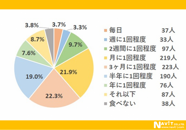 家庭で食べることが少ないせいでしょうか。「3ヵ月に1回程度」(223人)、「月に1回程度」(219人)、「半年に1回程度」(190人)の上位3つで6割以上という割合です。