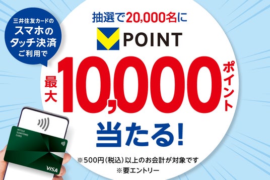 さらに同期間、V会員番号とSMBCグループのIDを連携の上、「三井住友カードのスマホのタッチ決済」でお支払いすると、抽選で20,000名にVポイントが最大10,000ポイント当たるキャンペーンも開催いたします。