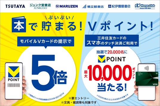 CCCMKホールディングス株式会社(本社:東京都渋谷区、代表取締役社長 兼 CEO:高橋誉則、以下「CCCMKHD」)と、三井住友カード株式会社(本社:東京都江東区、代表取締役社長:大西幸彦、以下「三井住友カード」)は、2024年11月1日(金)~11月30日(土)まで、TSUTAYA、丸善ジュンク堂書店、精文館書店、紀伊國屋書店、Honya Club With加盟店等の全国約900店舗の書店でのお会計時に「モバイルVカード」を提示すると、Vポイントが5倍になるキャンペーンを開催いたします。さらに、三井住友カードのスマホのタッチ決済でお支払いいただくとVポイントが最大10,000ポイント当たるキャンペーンも同時開催いたします。