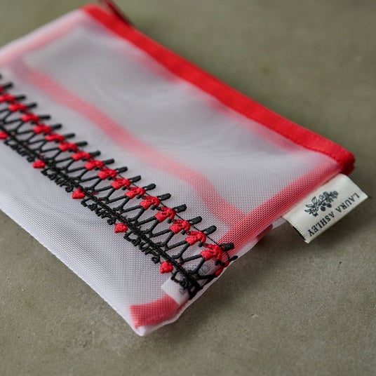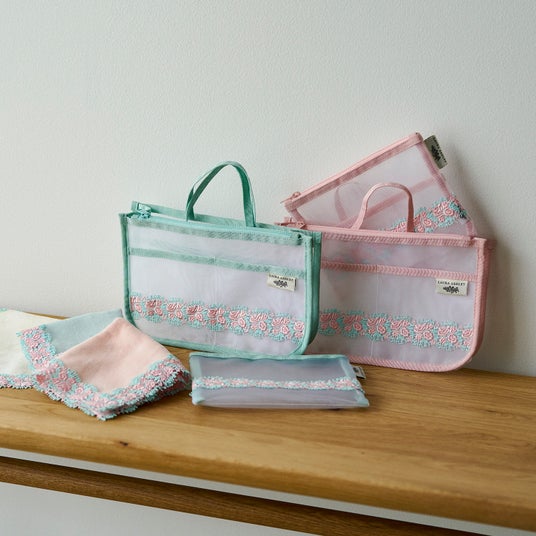 2月に発表したコラボレーションに続く第2弾は、ローラ アシュレイで人気のモチーフを120年以上の歴史を誇る近沢レース店のノウハウを生かし、繊細で美しいレースに近沢レース店の定番 メッシュ素材の小物に仕上げたスペシャルなアイテムです。