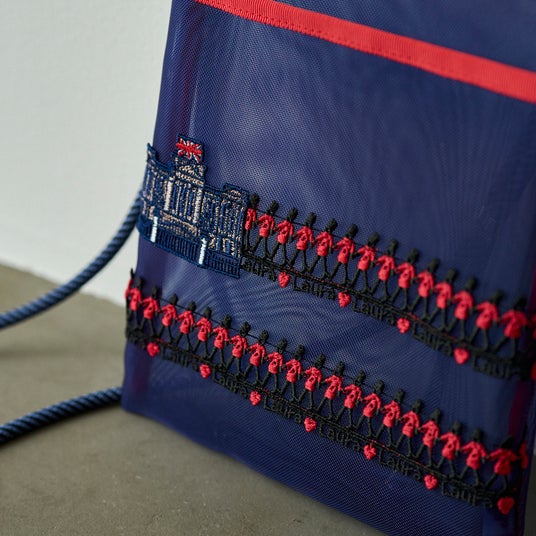 ユニオンジャックが掲げられたバッキンガム宮殿と英国の象徴 近衛兵をレースで表現したサコッシュ。