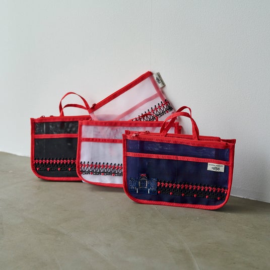 「便利をおしゃれに」をテーマに考えられた近沢レース店 定番のメッシュ小物シリーズ。行進している近衛兵、LAURAとハートが表現されたキュートなデザインは、バッグをあけるたびに癒されるシリーズ。
