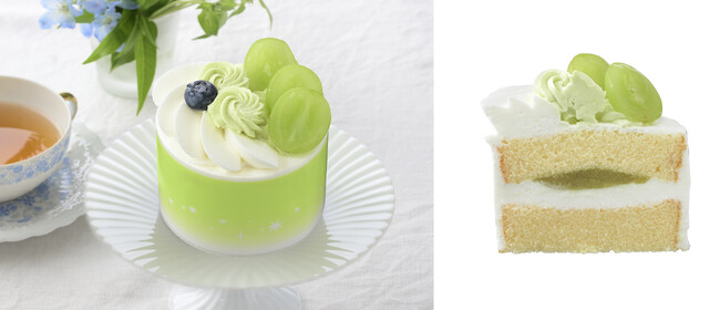 マスカットと相性のいいヨーグルト風味クリーム(マスカットゼリー入り)をマスカット風味スポンジでサンドし、上面にシャインマスカットを飾りました。