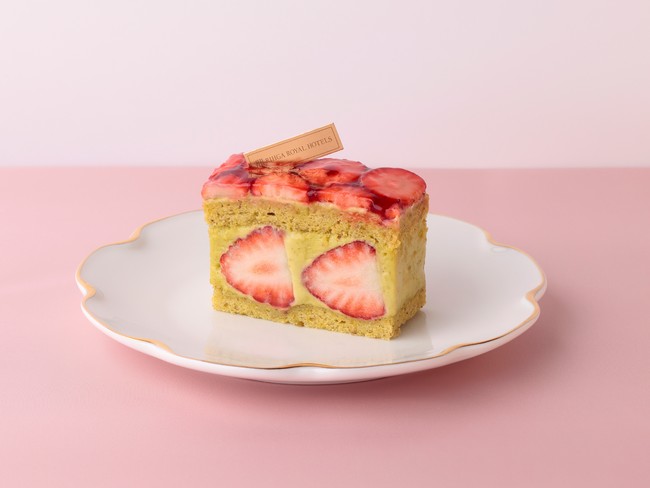 いちごは「紅ほっぺ」を使用。ピスタチオのクリームでいちごを閉じ込めて、ピスタチオ生地でサンドした、フランスの伝統的なショートケーキ。リキュールをきかせた大人の味に仕上げました。