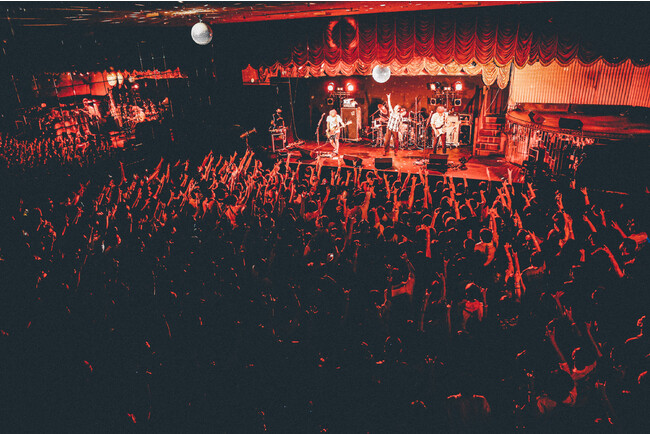 ステージに赤と金のドレープカーテン。天井には天の川のようなライト。壁の一面が鏡張りなので前日公演は音の反響が悪かったそうだが、この日はリハ時間を早めて音の鳴りを徹底改善したという。万全のコンディションまで持っていき、フロアの巨大ミラーボールを回すところからのスタートだ。