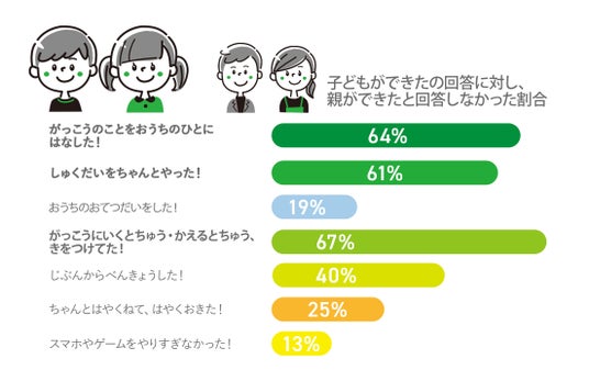 - 子どもが、「できた!」と思うことのランキング1位は「がっこうのことをおうちのひとにはなした」で49%。一方で、できたと回答した子どもの親の64%は「できていない」と回答。