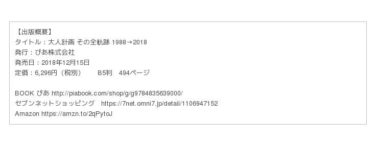 今年大人計画30周年を迎えたことを記念し、2006年に発売された『大人計画 その全軌跡 1988→2006』を再編集。2006年9月の「大人計画フェスティバル」から今年2018年夏に上演された「ニンゲン御破算(再演)」までを追加掲載しています。その膨大な量の各公演について、主宰の松尾スズキをはじめ、宮藤官九郎、宮崎吐夢、顔田顔彦らがコメント。 当時の貴重なエピソードや意外な事実などが盛りだくさん。また、再掲の「大人計画・同級生座談会」や関係者インタビューで語られているエピソードの数々は、12年後の現在さらに貴重さを増しています。