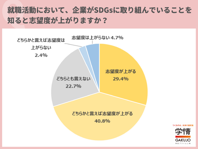 株式会社学情(本社:東京都千代田区)は、2025年3月卒業(修了)予定の大学生・大学院生を対象に、インターネットアンケートを実施。今回は、「SDGs」について調査しました。半数以上の学生が、仕事選びにおいてSDGsを意識していると回答。「仕事を通して社会課題の解決に貢献したい」「社会課題の解決に貢献する企業でないと、社会と良好な関係を築けないと思う」といった声が寄せられました。また、就職活動において、企業がSDGsに取り組んでいることを知ると「志望度が上がる」と回答した学生が7割を超えました。「SDGsの達成に貢献する企業のほうが業績も伸ばしていると思う」「SDGsの達成や、社会課題の解決に貢献しようとしている企業で働きたい」などの声が上がっています。