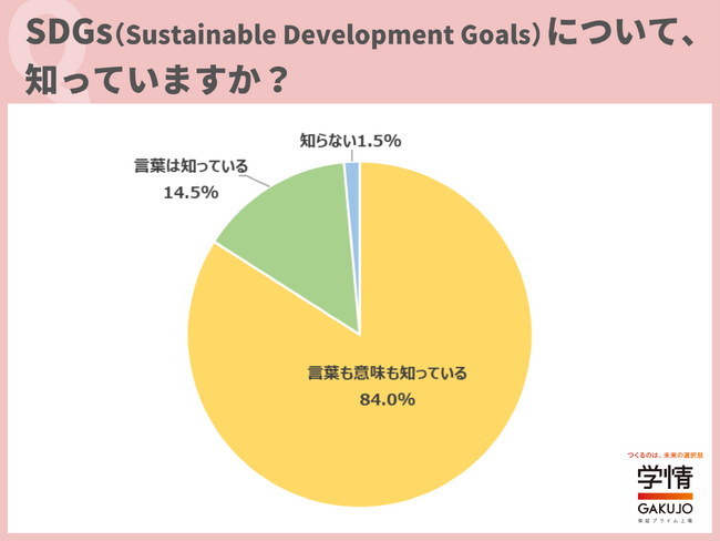 「SDGs(Sustainable Development Goals)」について、「言葉も意味も知っている」の回答が84.0%でした。「言葉は知っている」の回答14.5%も合わせると、「SDGs」の認知率は98.5%となりました。