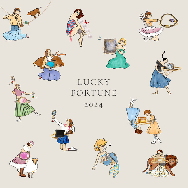 人気イラストレーターfoxco氏が今回のために特別に描き下ろしたイラストを添え、新たな一年を幸運に導くためのお守りジュエリーとともに、2024年を指南します。