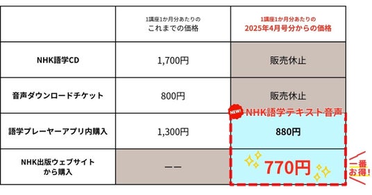 これまでは1講座1か月分の音声の価格は『NHK語学CD』では1,700円(税込)、『音声ダウンロードチケット』では800円(税込)でしたが、『NHK語学テキスト音声』はNHK出版ウェブサイトでの販売価格が770円(税込)とこれまでよりお買い得になります。